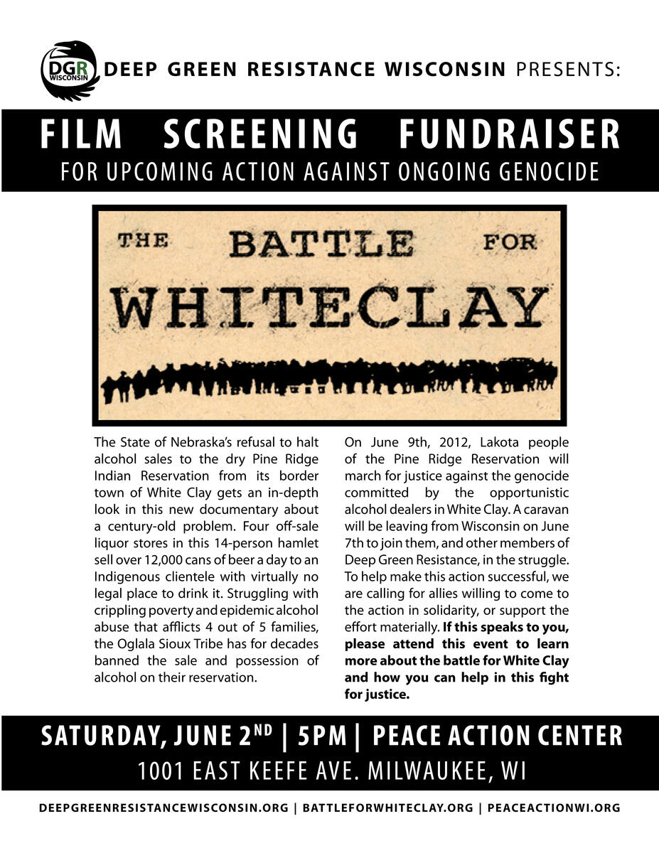 Join Deep Green Resistance Wisconsin at the Peace Action Center on Saturday, June 2nd for a film screening of The Battle for Whiteclay and a presentation about an upcoming action in solidarity with Lakota peoples against the ongoing genocide facing Native Americans. The event will start at 5:00 PM at 1001 E. Keefe Ave. in Milwaukee, WI.